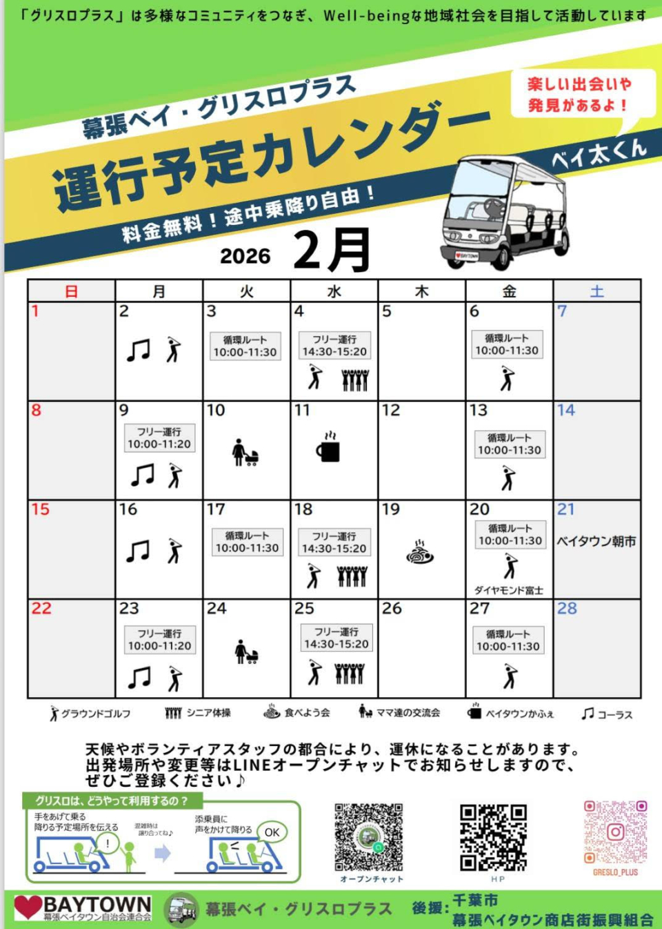 2026.2.1 2月のグリスロ運行予定カレンダーのお知らせ 2月の運行予定カレンダーのお知らせです。火曜日と金曜日は循環ルート便を継続運行しています。 今月は2/21(土)の朝市にて試乗会を開催しますので、是非ご利用ください。 チラシのQRコードから、最新情報などを投稿しているオープンチャットにご参加ください。 皆さまのご利用・ご意見をお待ちしています!